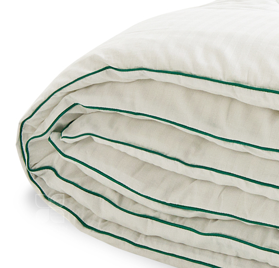 Одеяло выполнено из ткани 100 % хлопка сатин с тиснением страйп в белом цвете, отделка по краю кантом травяного цвета, фирменная упаковка конверт ПВД, спанбонд.